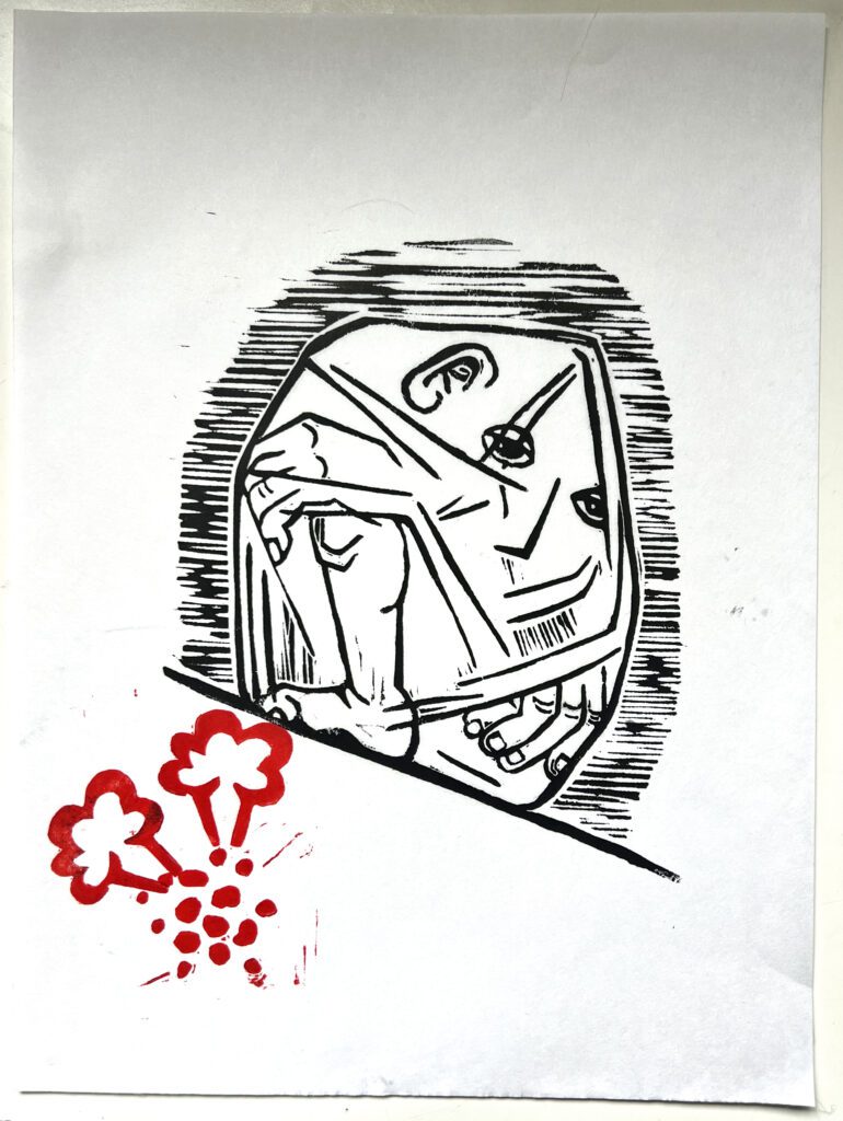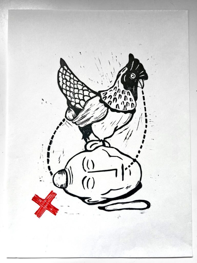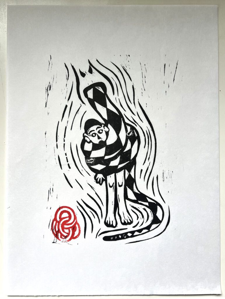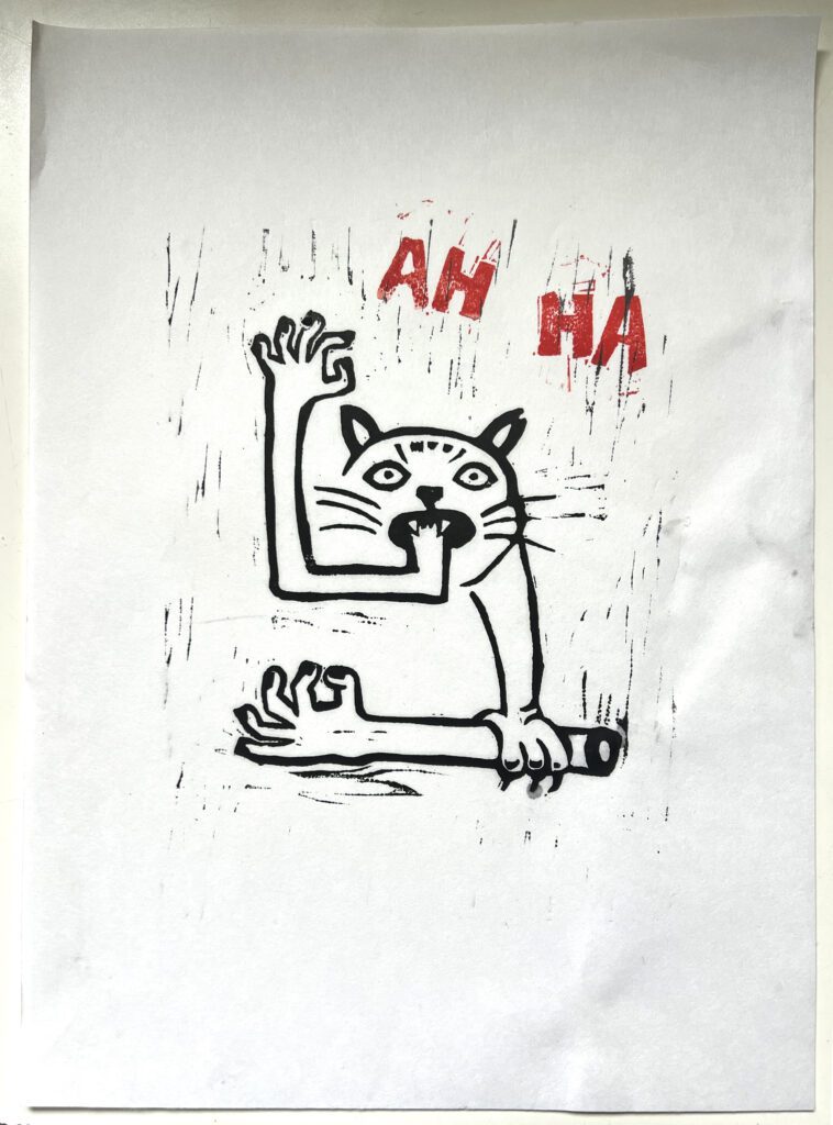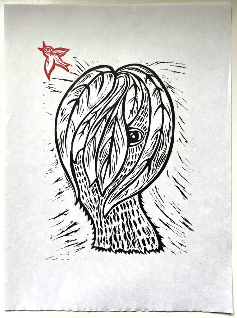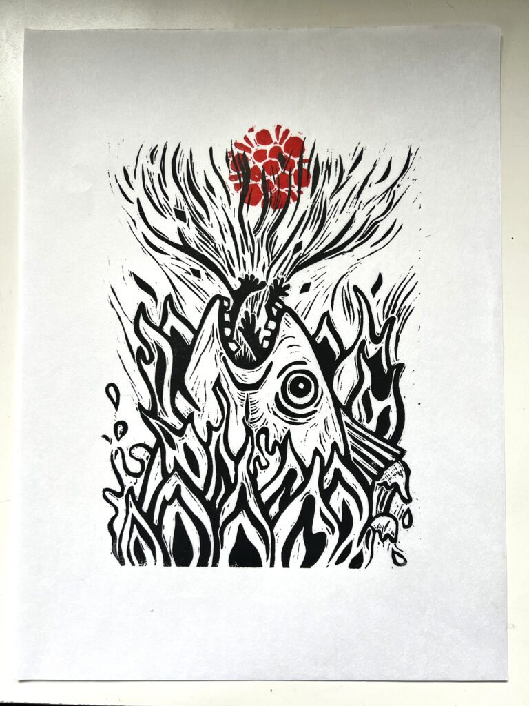 2-color hand-carved linocut prints. Each image is a variable open edition. The images explore the themes of animal revenge, interspecies mingling, and isolation.