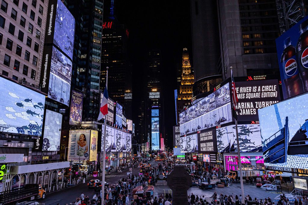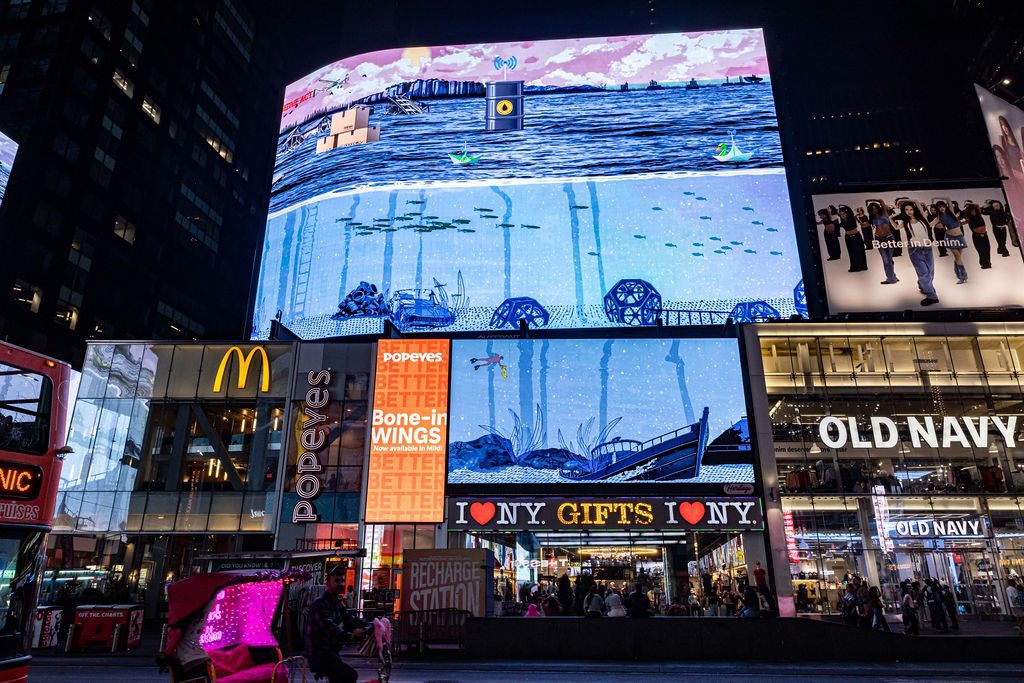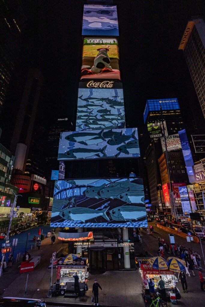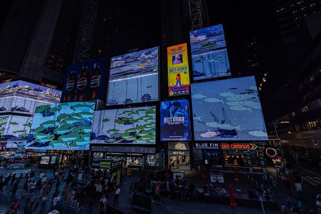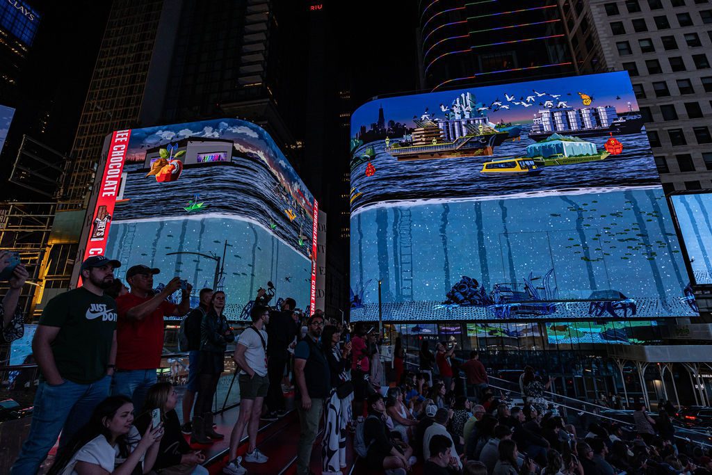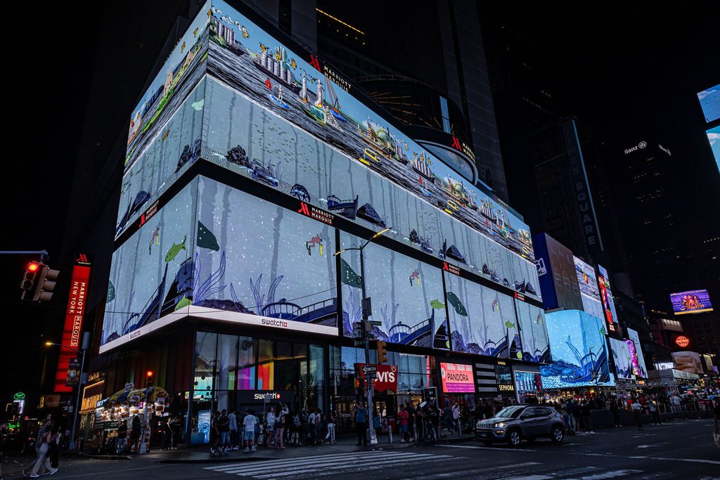 A multi-channel animation that journeys through a complex choreography of ecological and social systems, The River is a Circle (Times Square Edition) by artists Marina Zurkow and James Schmitz depicts a split view of the Hudson River that spans centuries. Below the water, we encounter schools of fish, oyster reefs, maritime wreckage and divers; above the water, ships and barges move through colonial times and the ever-evolving Meatpacking District into an imagined future — speculating on circular systems and the potential for a cyclical flow towards more modest means of maintaining our environmental networks.